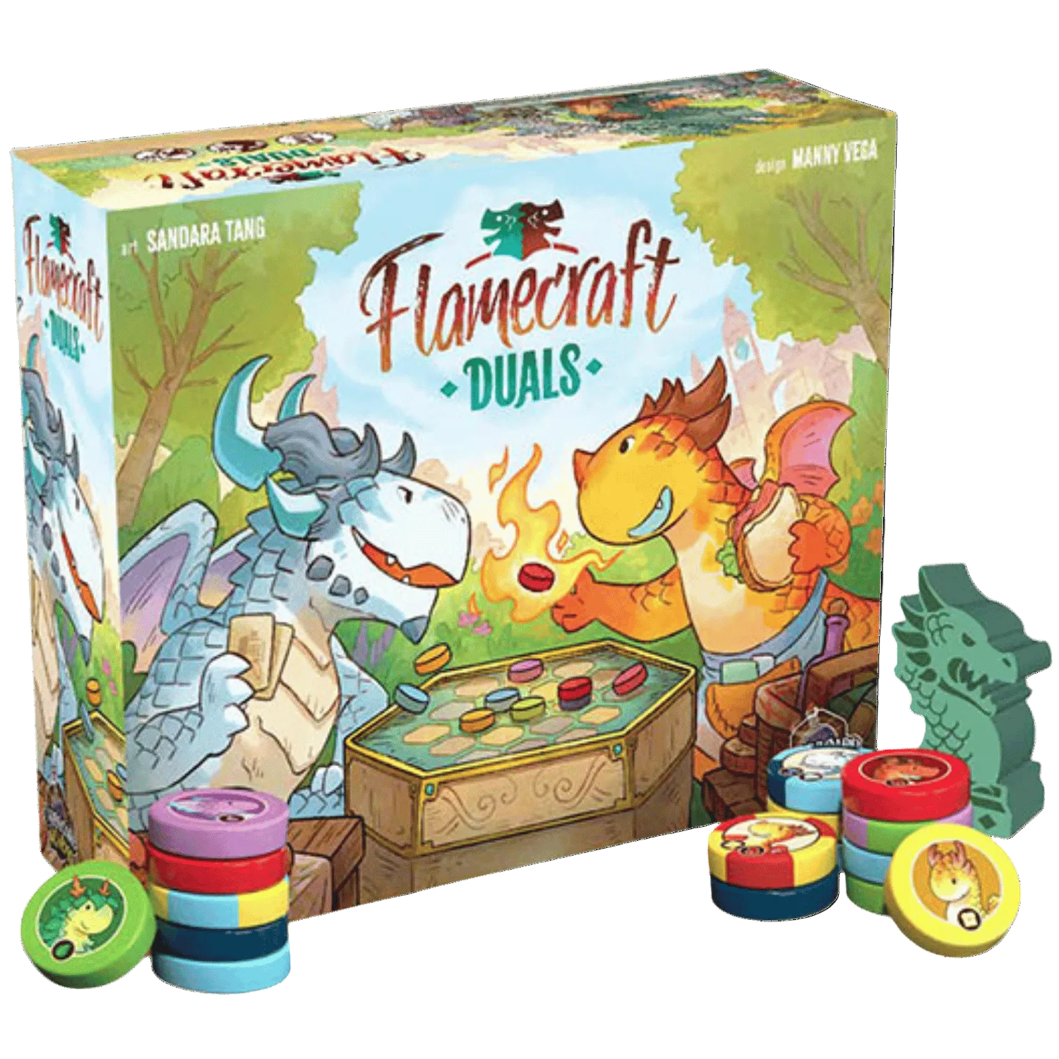 Ever wondered what the dragons of Flamecraft do on their lunch break? Play Flamecraft Duals, of course! Set in the world of Flamecraft, Duals is a two-player travel-friendly game of pattern-making and quick, puzzly fun! You will meet the artisan dragons again with new powers, and this time the challenge is to get your dragons in a row. As you draw dragons, you might get lucky and come across a rare dual-colored Hydragon, with double the artisanal skills! As you play, the board will fill up with adorable dragons, stacking and soaring across the table, and you will work to fire-up their abilities, make matches, and complete shop cards.