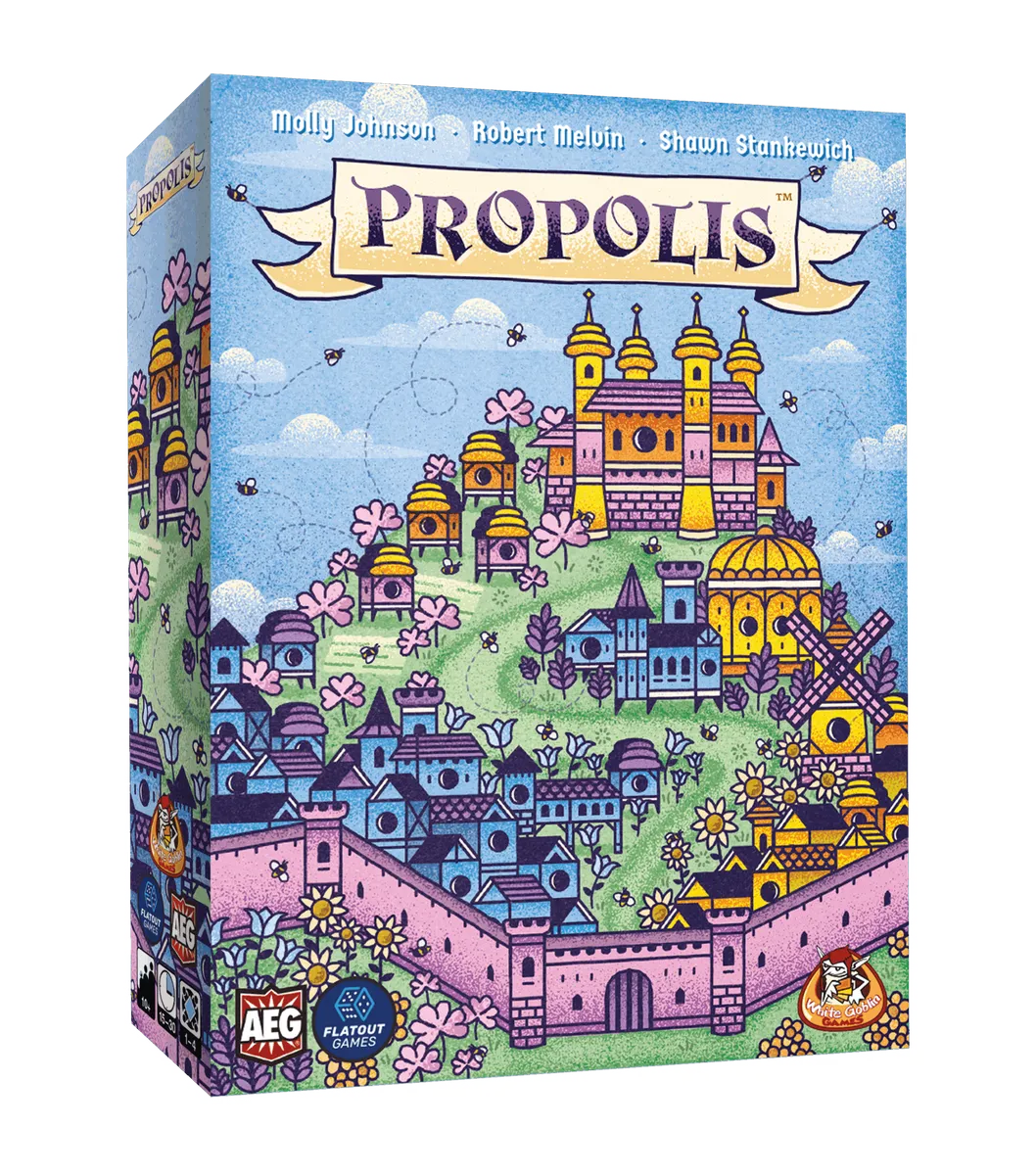 Propolis is a worker-placement, engine-building, area-control, and tableau-building game. Players take on the role of competing medieval bee colonies and take turns deploying worker bees to collect pollen, fortify their positions, and construct their hives to appease their queen and become the most glorious in the land!